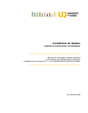 Université du Québec. (2025) Constitution du Québec. Liberté et autonomie universitaire. Mémoire de l’Université du Québec présenté à la Commission des institutions dans le cadre des consultations sur le projet de loi n° 1, Loi constitutionnelle de 2025 sur le Québec.